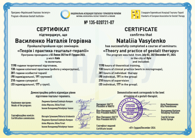 Почему на ваших сертификатах указана одна фамилия, а вы на сайте и в социальных сетях используете другую? Хороший вопрос, который может у вас возникнуть. Кохан — это фамилия моего рода по женской линии, а Василенко — фамилия моего папы, которую я не меняла даже, когда вышла замуж. Обе для меня ценны и обе про меня. Многие люди используют псевдонимы и для меня это — про свободу самовыражения. Свобода самовыражения — это то, над чем я, кстати, люблю работать со своими клиентами. Поэтому на сертификатах вы видите фамилию, которая указана во всех документах, начиная с рождения, а здесь и во всех социальных сетях — я Наташа Кохан и мне с этой фамилией гораздо ближе и роднее.